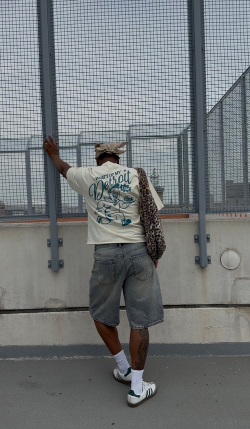 What's Up My Detroit Fam T-shirt with logo on left chest & back. This is regular fitted Tee. The fabric is light weight and very soft. The base of the shirt is pink and the print is a plum color